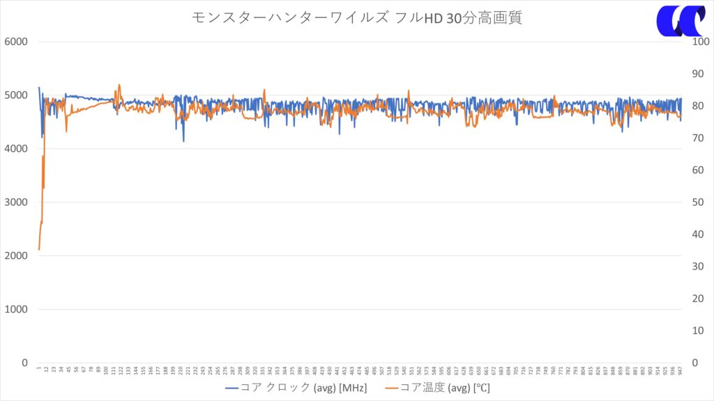 『モンスターハンターワイルズ』を高画質・フルHD設定で30分間プレイした際のCPU動作を計測しました。