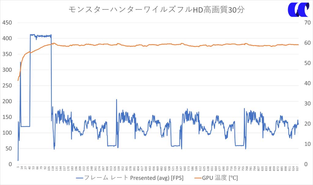 モンスターハンターワイルズのベンチマークソフトをWQHD高画質で30分ループさせた際の挙動を確認します。