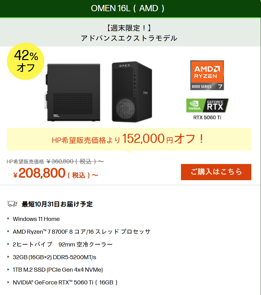 HP公式ストアでは現在、最新のAMD CPUとRTX 5060 Ti(16GB)を搭載した