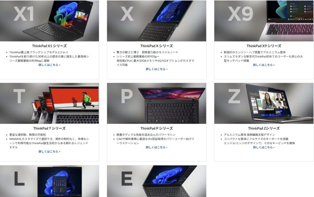 ThinkPadシリーズには、E/L/Z/P/T/X9/X/X1 といった複数のラインが存在します。