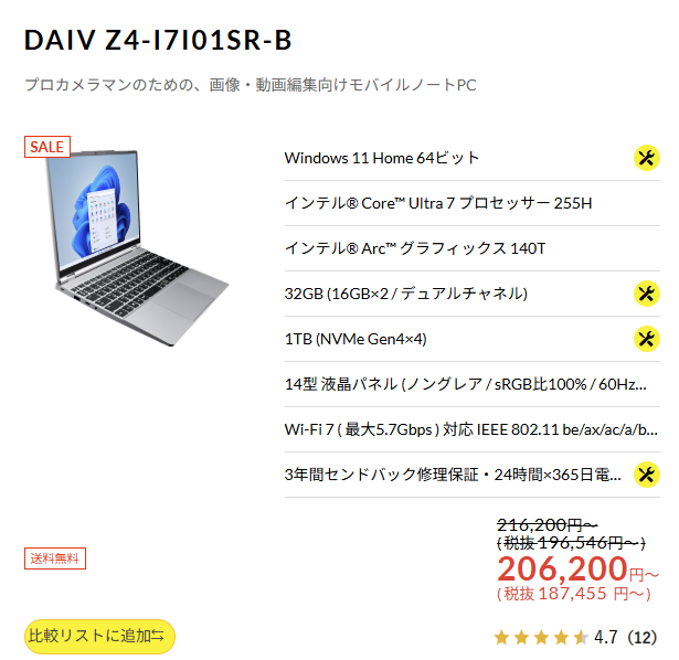 プロクリエイター向けモバイルノート 「DAIV Z4-I7I01SR-B」 が
