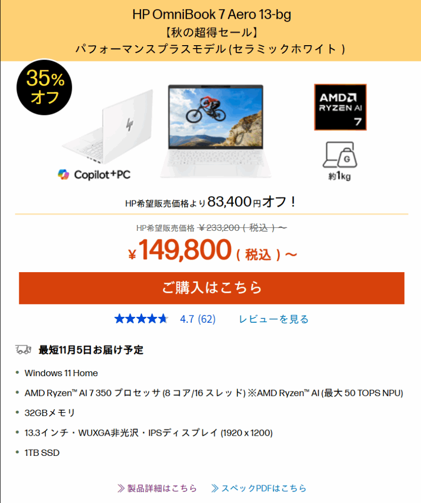 ホームセール【11月17日まで】1kg切りのAIノートPC「HP OmniBook 7 Aero 13」が14.9万円で激安セール中!