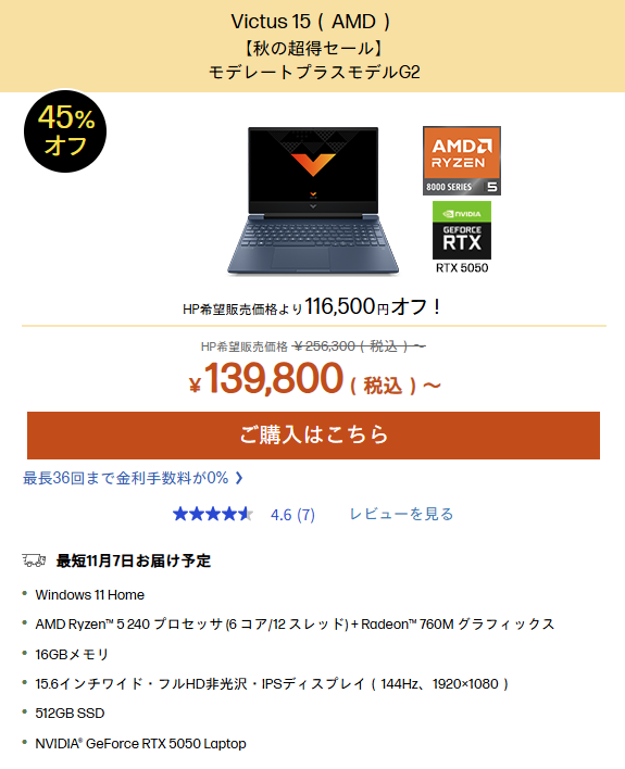 ホームセール【11月17日まで】RTX 5050搭載ゲーミングノートが13.9万円!HP Victus 15が過去最安級セール中