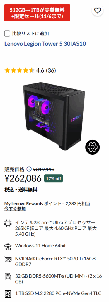 ホームPCトレンド速報【11月6日まで】RTX 5070 Ti+32GBメモリ搭載!Lenovo Legion Tower 5iが26.2万円で最安級セール中