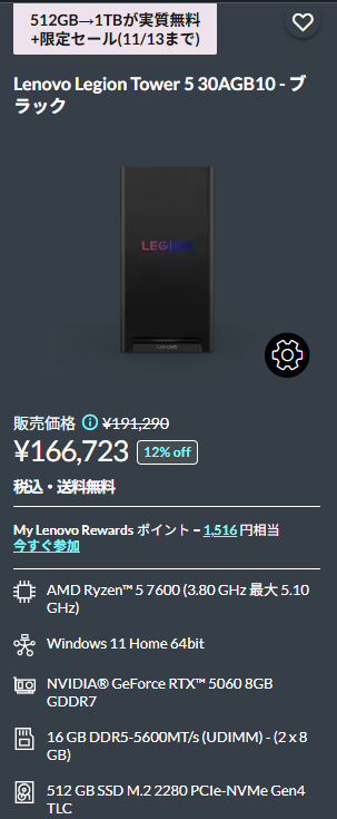この構成で16万円台は、RTX 5060搭載機として過去最安級の価格です。