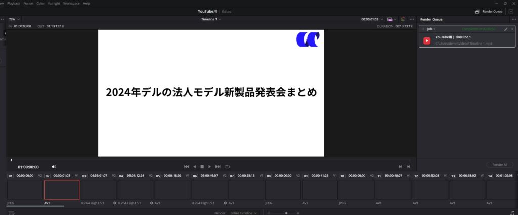 DaVinci Resolveによる13分動画(H.264 / YouTubeプリセット)の書き出し時間は約9分50秒でした。