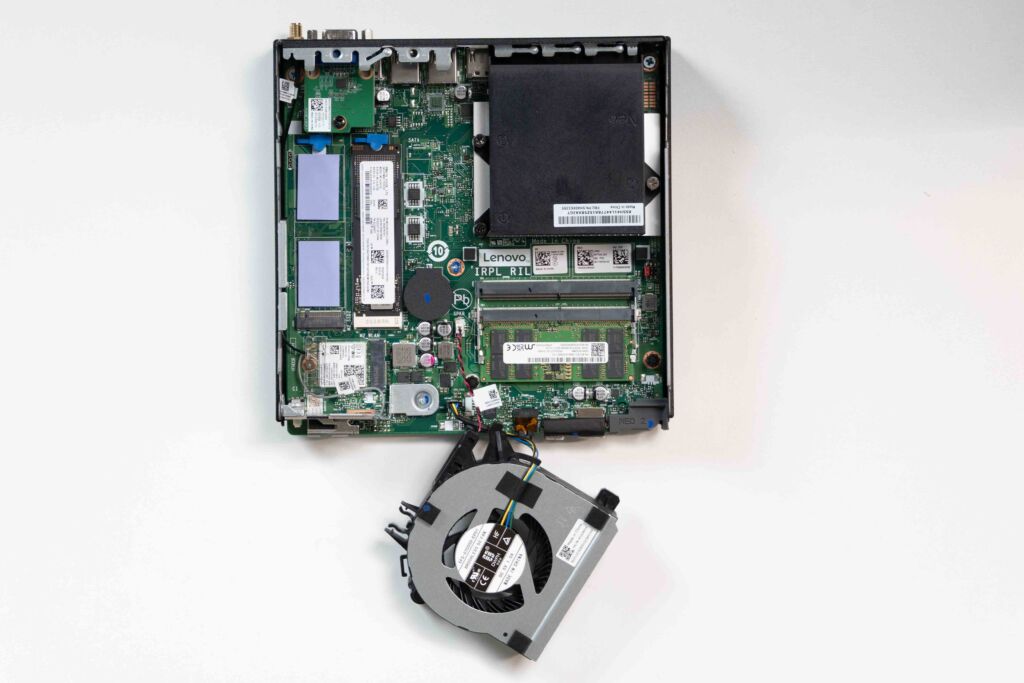 天面カバーを外すと、ThinkCentre neo 50q Tiny Gen 5の内部には効率的に配置された冷却システムと拡張スロットが見えます。