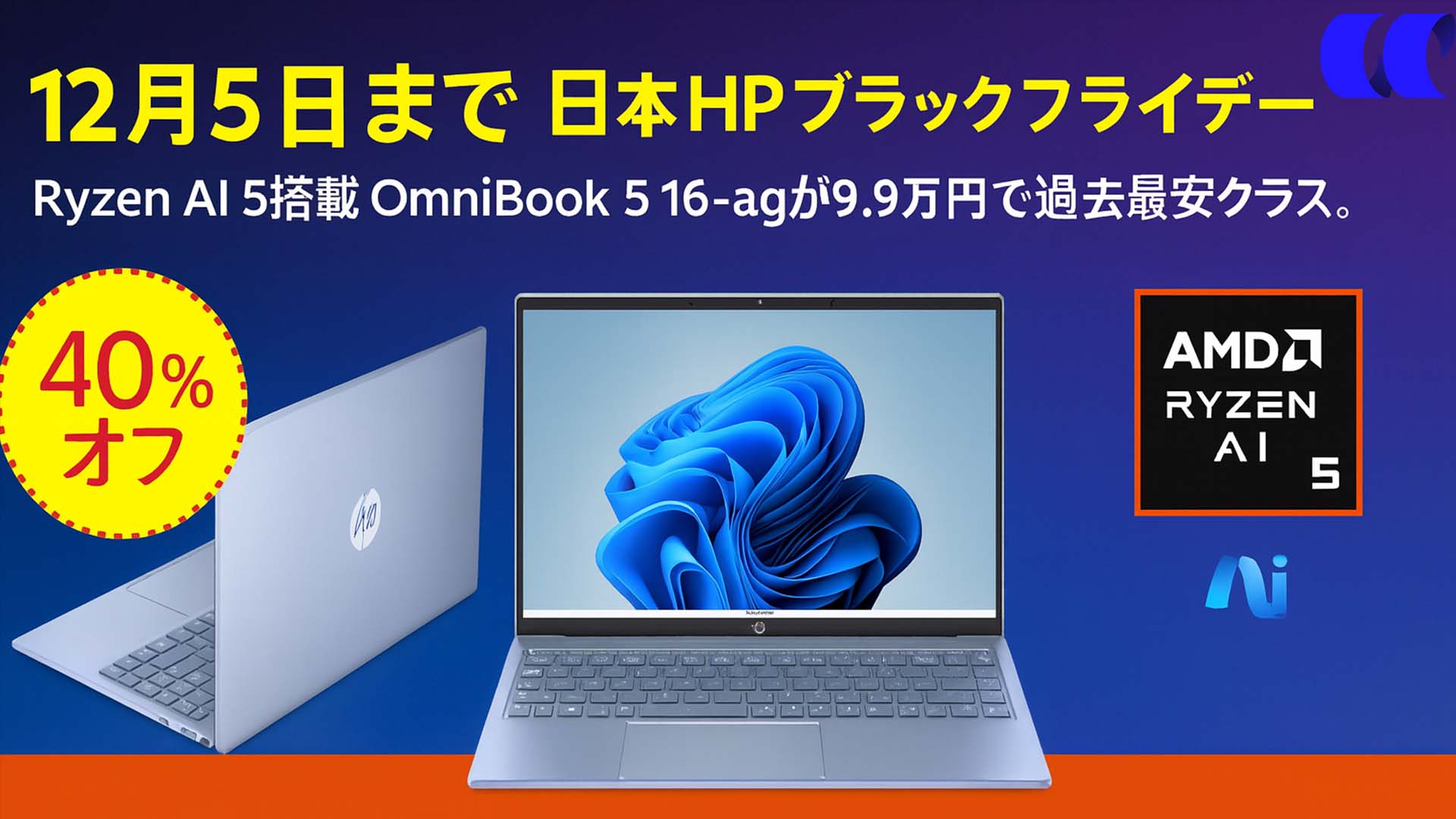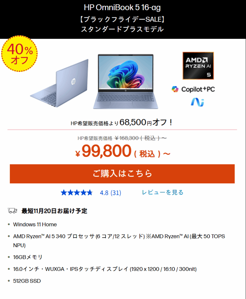 Ryzen AI 5 340搭載の16型ノートPC「HP OmniBook 5 16-ag(スタンダードプラスモデル)」が**99,800円(税込)**まで値下がりしています。