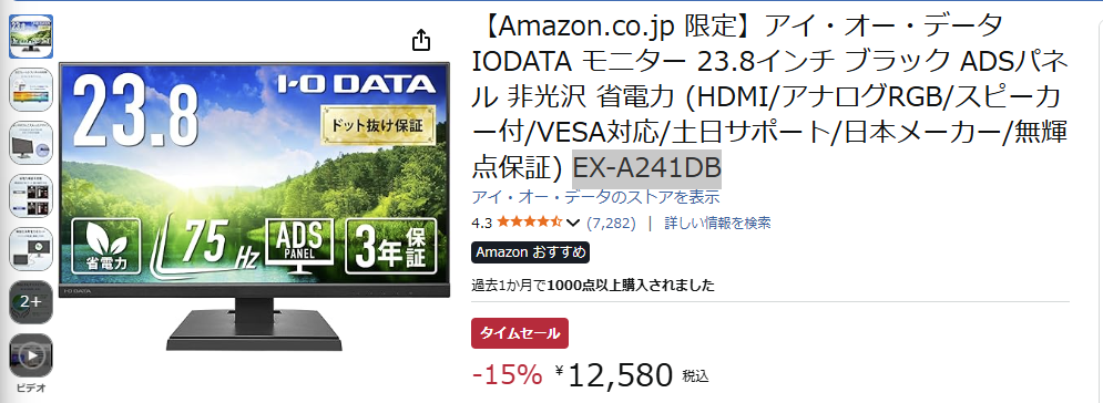 アイ・オー・データの23.8インチモニター 「EX-A241DB」 が、Amazonで**12,580円(税込)**のセールになっています。