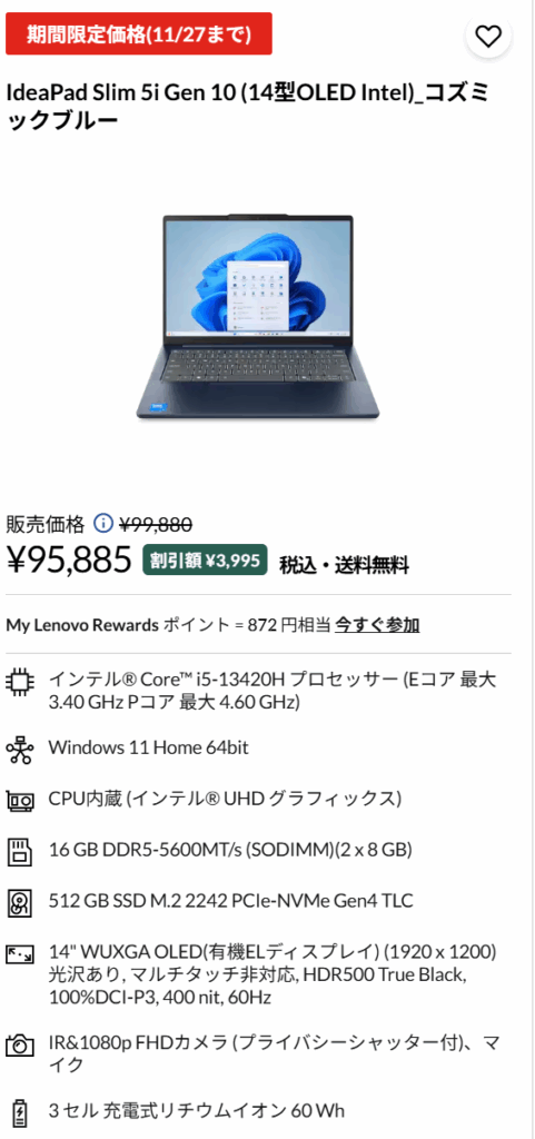 14型有機ELディスプレイを搭載したノートPCが**95,000円前後(税込)**まで値下がりしています。
