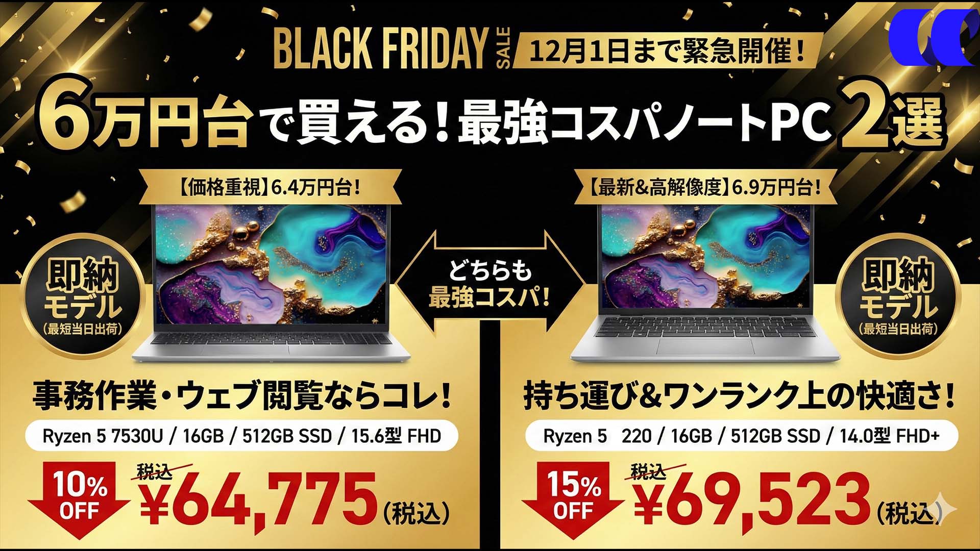 Dellのブラックフライデーでは、普段使い・事務作業・オンライン授業などに最適な“売れ筋ノートPC”が 6万円台まで値下げされています。