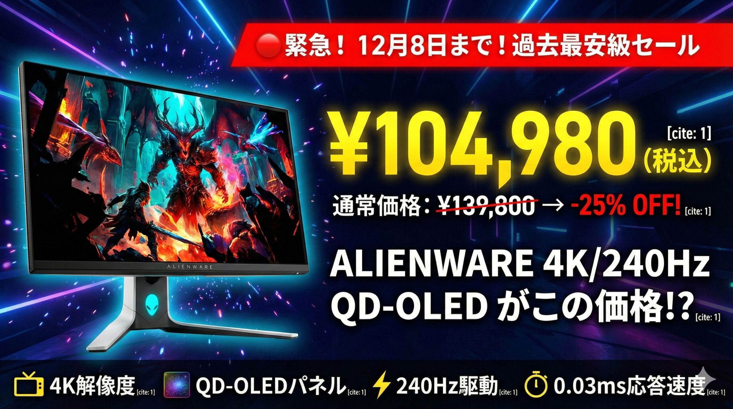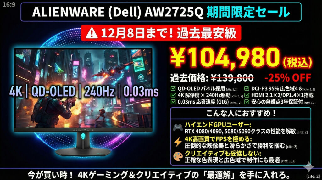 4K/240HzのOLEDはまだ選択肢が少なく、10万円台前半で買えるのは今だけの価格帯。RTX 4080/4090・RTX 5080/5090クラスを使っている人や、4Kで滑らかにFPSを楽しみたい人にとって、今回のセールは間違いなく“買い時”と言えます。