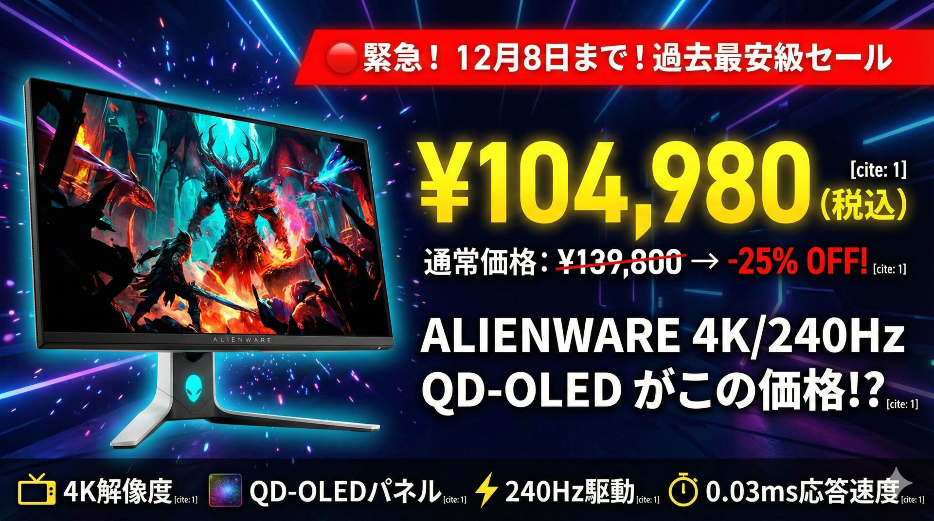 通常は 12万〜15万円前後で販売されているハイエンドQD-OLEDモニターですが、今回ここまで値下がっているのは、年明け以降に後継モデル(リフレッシュ版)が登場する可能性が高いためだと思われます。メーカー側が年末のタイミングで現行在庫を一気に整理するパターンは毎年よくある動きで、価格が落ちるときは一気に下がるのが特徴です。