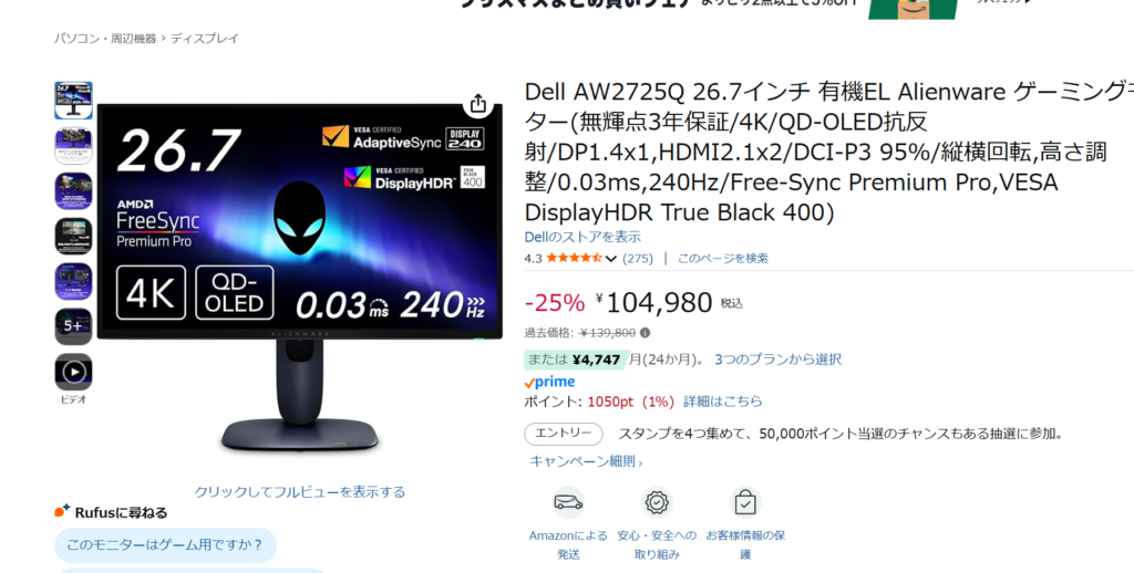 **AW2725Q(26.7インチ / QD-OLED / 4K / 240Hz)**が、