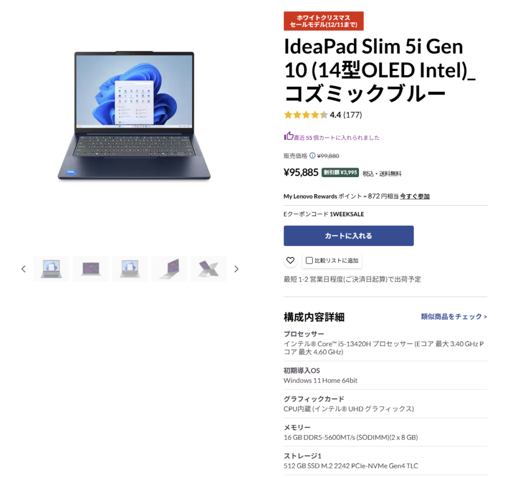 IdeaPad Slim 5i Gen 10 は、14型の高画質OLED(有機EL)を搭載した10万円以下の高コスパノートPCです。据え置き用途にも持ち運び用途にも対応できる1.46kgのバランス型で、事務作業・動画視聴・ブラウジングを非常に快適にこなせます。Core i5-13420H+16GBメモリ+512GB SSDという“長く使える標準構成”で、ノートPCの最初の1台としても、2台目のリビング用PCとしてもおすすめ。OLEDならではの色鮮やかな映像体験も魅力で、セール価格(95,885円)はクリスマスセール期間の注目株です。