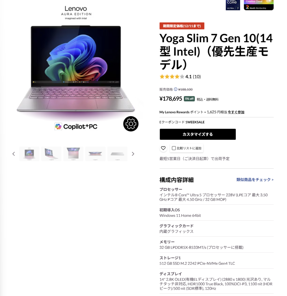 Yoga Slim 7i Gen 10(14型 Intel)は、1.19kgという驚異的な軽さで、2.8K OLEDを搭載する超ハイスペックノートPC です。OLEDの高画質とCore Ultra 5によるAI高速処理で、画像編集・ライト動画編集・RAW現像まで快適にこなせるクリエイター向けの一台。さらにバッテリー持続時間が14型クラスの中でもトップクラスで、外出先での作業時間が非常に長い点も大きな魅力。競合機より軽く、性能とバッテリー、取り回しの良さがすべて揃っており、クリエイター×モバイル環境のコスパ最強モデル と言える完成度です。