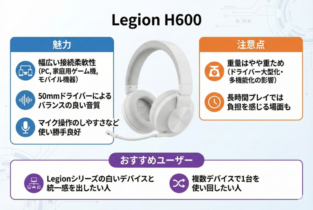 Legion H600は、PCはもちろん家庭用ゲーム機やモバイル機器まで幅広く接続できる柔軟性が魅力のワイヤレスヘッドセットです。50mmドライバーによるバランスの良い音質や、マイク操作のしやすさなど使い勝手の面もよくまとまっています。一方で、ドライバーの大型化や多機能化の影響もあり重量はやや重たく、長時間プレイでは負担を感じる場面があるかもしれません。とはいえ、Legionシリーズの白いゲーミングデバイスと組み合わせて統一感を出したい人や、複数デバイスで1台を使い回したい人には十分選択肢になるモデルです。