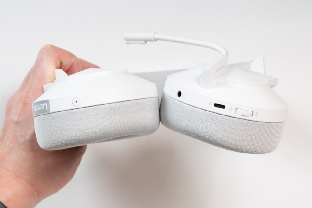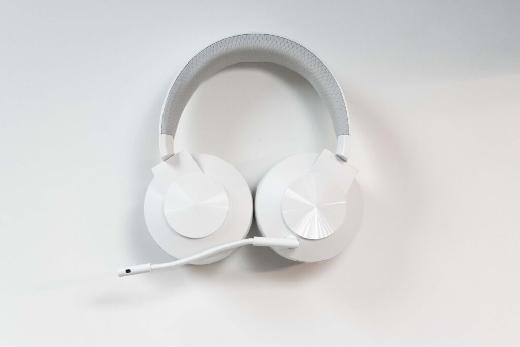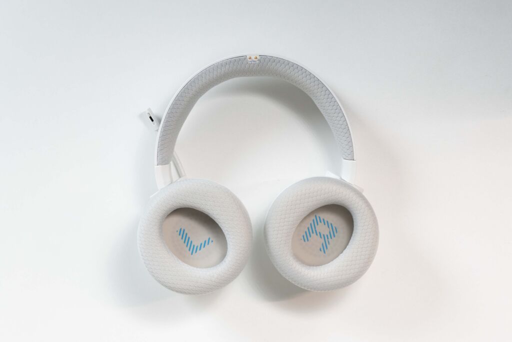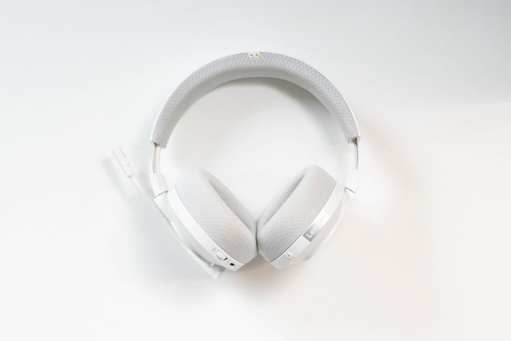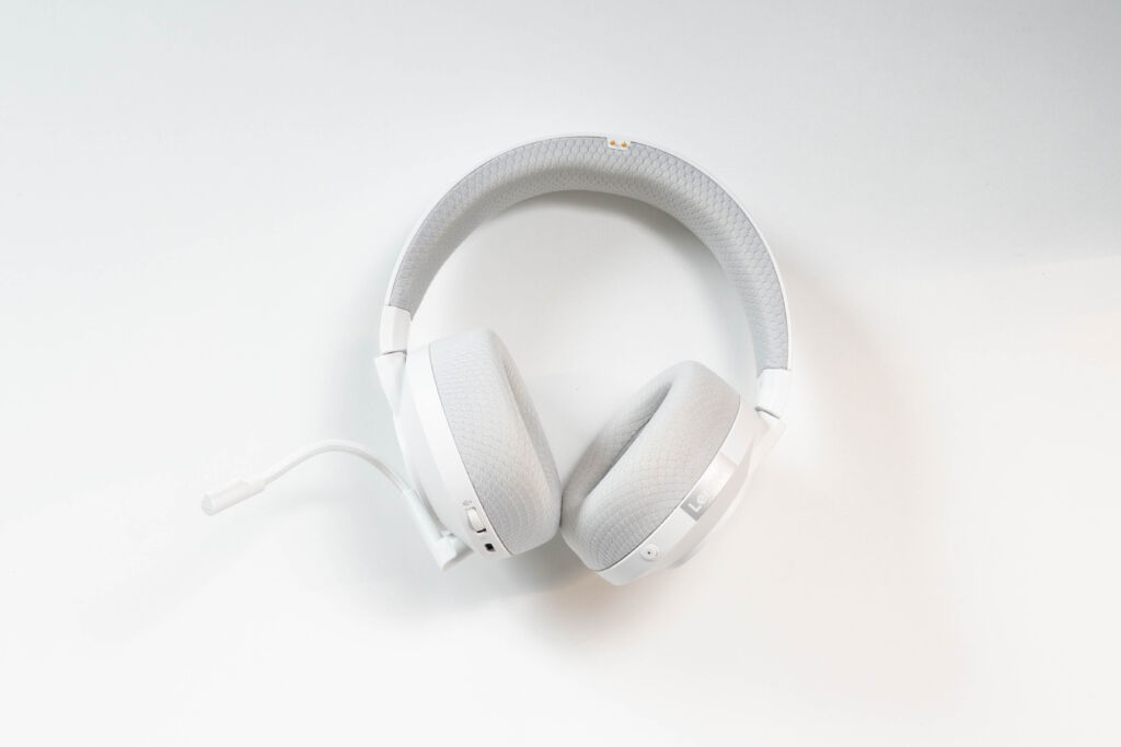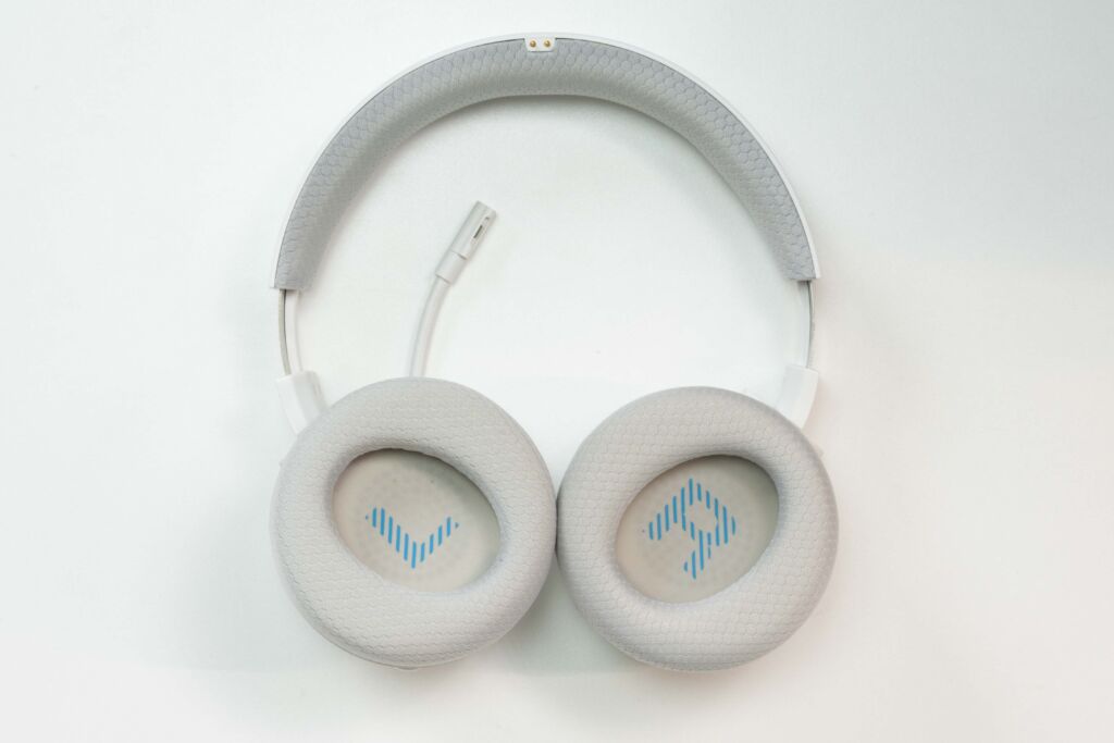 Legion H600のスティングレイモデルは、白と淡いグレーを組み合わせた柔らかい配色が特徴で、ゲーミングデバイスというよりは生活空間に自然に馴染むデザインになっています。ヘッドバンドやイヤーパッドにはメッシュ調の生地が使われており、見た目にも質感がありつつ、派手さを抑えた落ち着いた印象です。光沢の少ないマット系の仕上げが中心のため、白デスクやインテリア重視の環境でも違和感がなく、従来の「黒×RGB」なゲーミングヘッドセットとは明確にテイストが異なります。その一方で、金属アームや側面のシルバーアクセントが適度に存在感を出しており、シンプルすぎずバランスの良いデザインです。