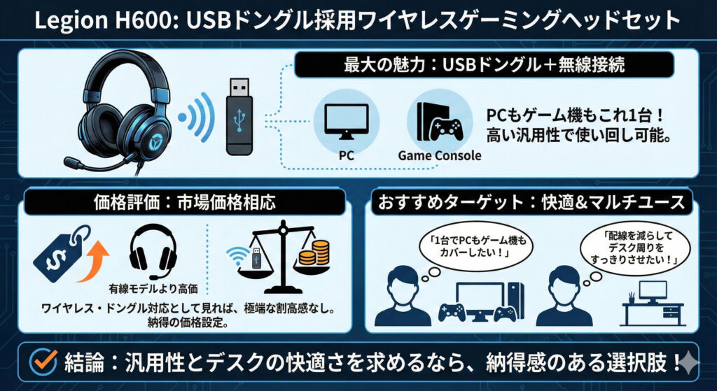 Legion H600は、USBドングル接続に対応したワイヤレスゲーミングヘッドセットで、