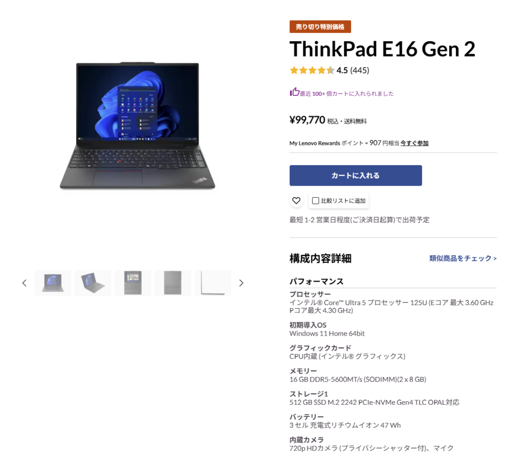 ThinkPad E16 Gen 2は、Core Ultra 5 125Uを搭載したビジネス向けスタンダードノートPCです。