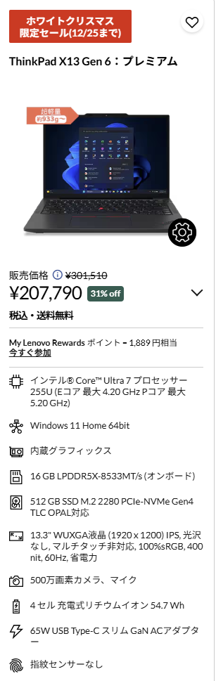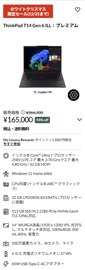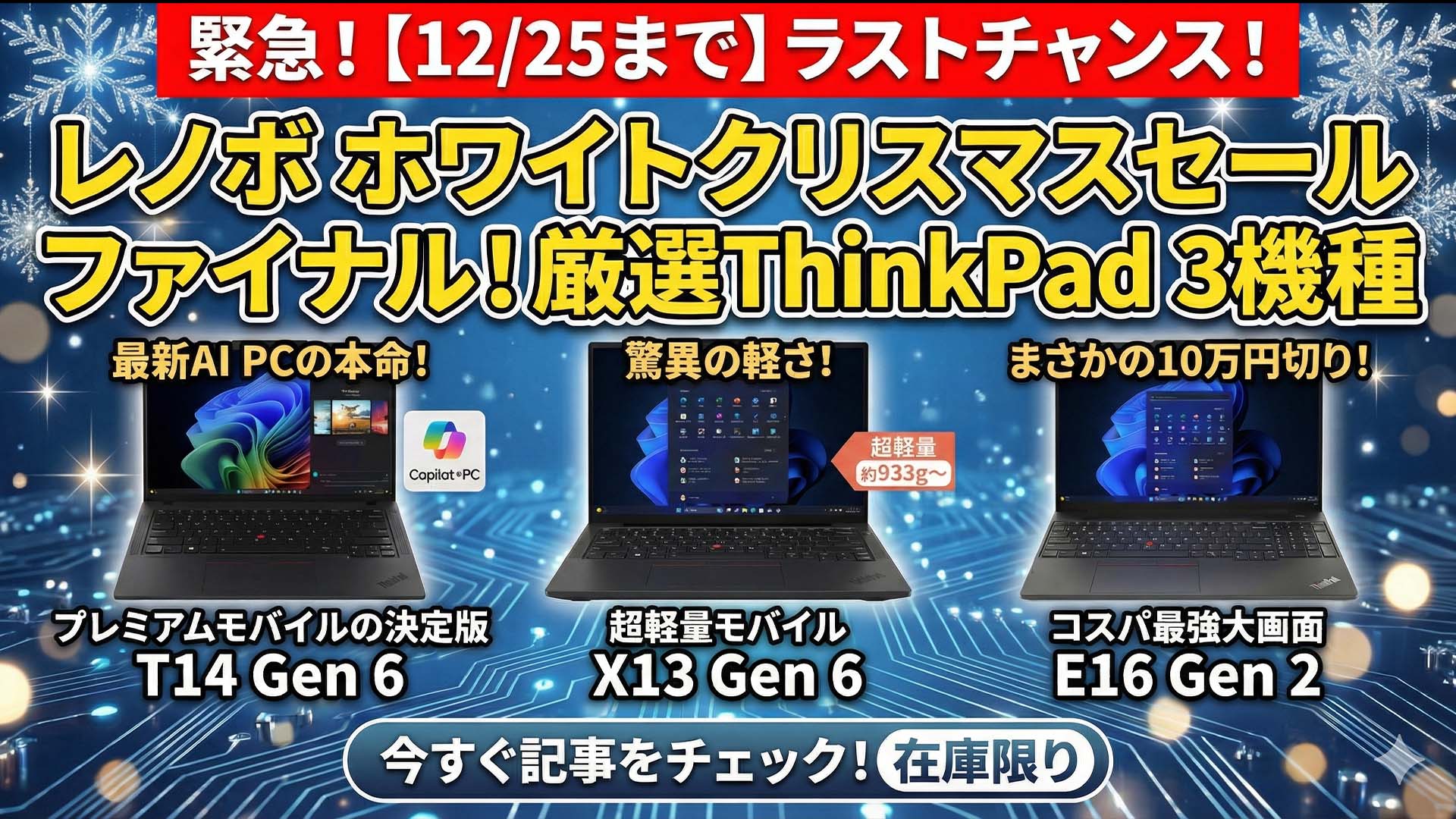12月25日まで開催されているレノボのホワイトクリスマスセールは、ThinkPadが1年で最も“買い”になるタイミングです。法人向け品質で定評のあるThinkPadは、通常価格では高価になりがちですが、今回のセールではメモリ32GB構成や旧型CPU搭載モデルが大幅値引きされています。本記事では、その中でも「今あえて選ぶ価値がある」モデルを用途別に3機種厳選して紹介します。