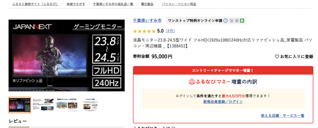 千葉県いすみ市の返礼品として提供されている、JAPANNEXT製のフルHD・240Hz対応ゲーミングモニターです。