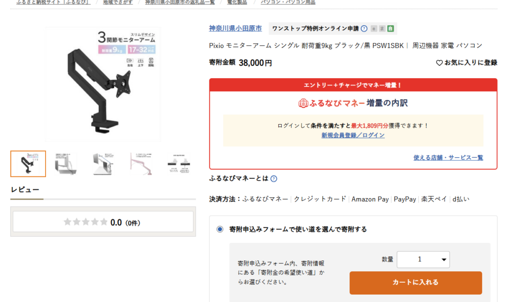 神奈川県小田原市の返礼品として提供されている、Pixio製のシングルモニターアームです。