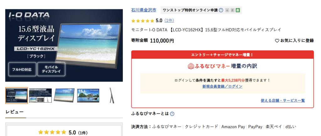 石川県金沢市の返礼品として提供されている、I-O DATA製の15.6型モバイルモニターです。