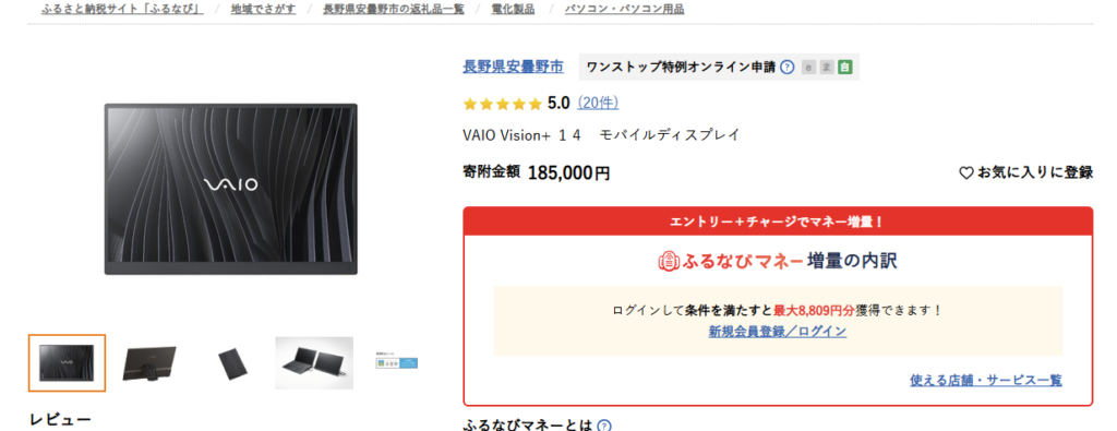 寄付額18万円台|長野県安曇野市法人グレードのモバイルモニター VAIO Vision+ 14