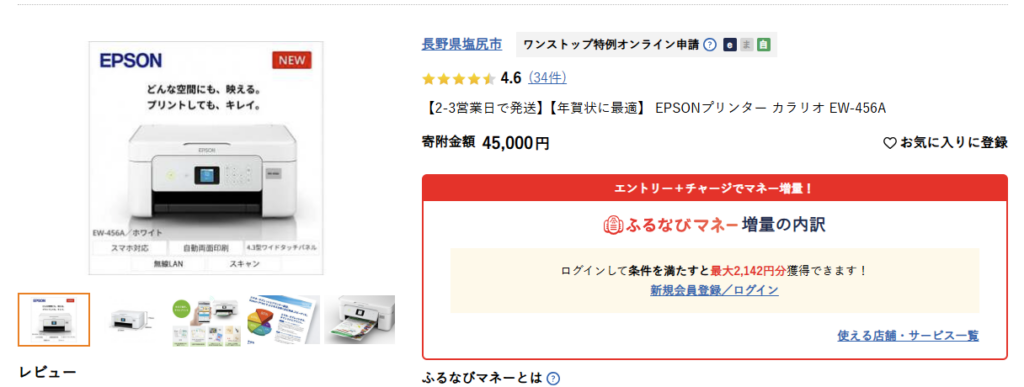 **長野県塩尻市の返礼品として提供されている、エプソン製のインクジェットプリンター(EW-456A)**です。