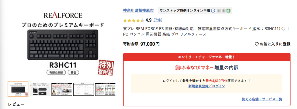 **神奈川県相模原市の返礼品として提供されている、東プレ製の高級キーボード「REALFORCE R3(R3HC11)」**です。