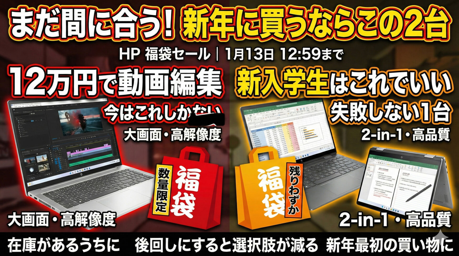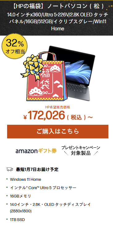 1月13日まで開催されている 日本HPの福袋セールは、年始タイミングでも価格メリットが大きく、ノートPCを買い替えたい人にとって見逃しにくい内容です。特に今回は、数が多い福袋モデルの中から性能・価格・使い道が明確な2機種だけを厳選。普段使いから仕事まで安心して使える構成で、セール終了後の値上がりや在庫切れを考えると、**「今このタイミングで選ぶ意味があるノートPC」**と言えるモデルです。どれを選べばいいか迷っている人ほど、まずチェックしてほしい内容です。
