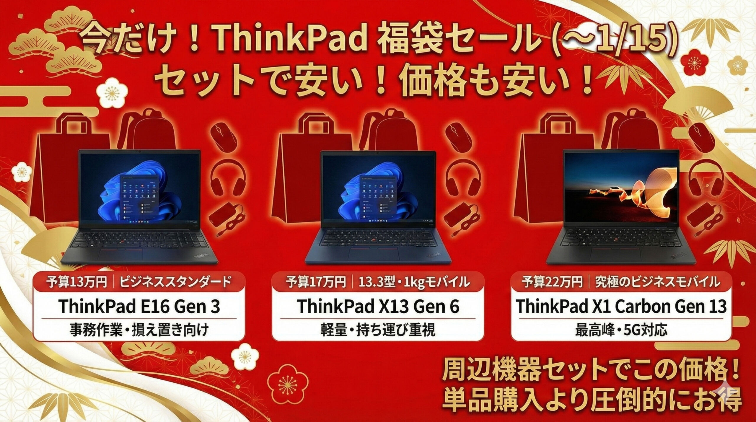 性能・価格・用途のバランスが取れたThinkPad福袋を3機種厳選して紹介します。