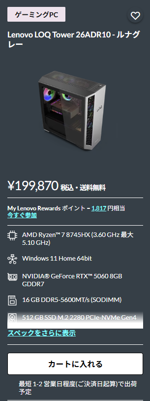 予算18万円最短1週間程度出荷 RTX5050搭載モデル Lenovo LOQ Tower 26ADR 10(優先生産モデル)
