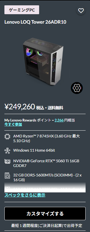 この Lenovo LOQ Tower 26ADR10(優先生産モデル) です。