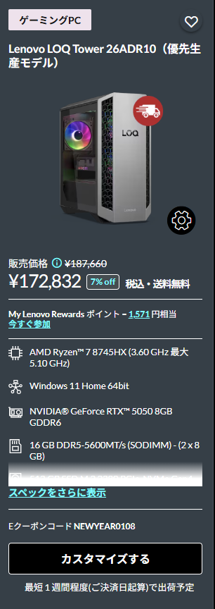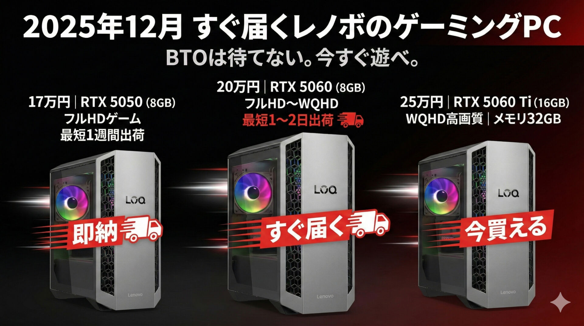 この記事では、2025年12月27日時点で「比較的すぐ届く可能性が高い」レノボのゲーミングPCを中心に解説します。