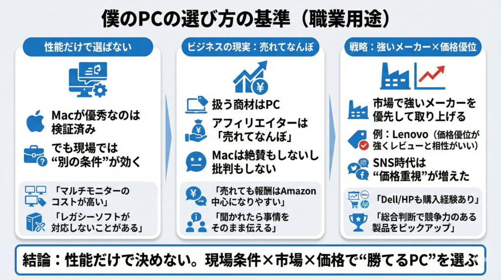 この判断には、ビジネス上の戦略も絡みます。そもそも僕が扱っている商材はPCで、YouTubeでは毎回ストレートに紹介していますが、僕たちアフィリエイターは「売れてなんぼ」です。Macが売れても、せいぜいAmazonから報酬が入る程度なので、わざわざ絶賛する理由もない。かといって、性能的に批判する必要もない。だからライブ配信などで聞かれたときは、今書いているような事情をそのまま伝えますし、このスタンスは今後も変わらないと思います。