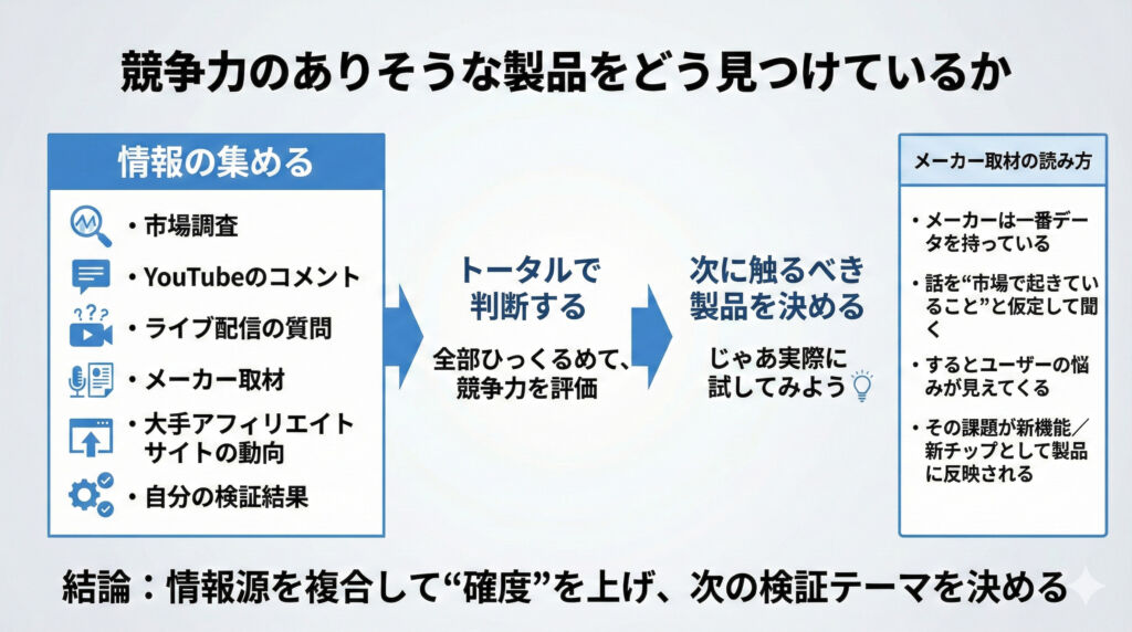 競争力がありそうな製品をどう判断しているかというと、市場調査、YouTubeにつくコメント、ライブ配信で寄せられる質問、メーカー取材、大手企業のアフィリエイトサイトの取り上げ方、そして自分の検証結果——これらを全部ひっくるめて、トータルで判断しています。