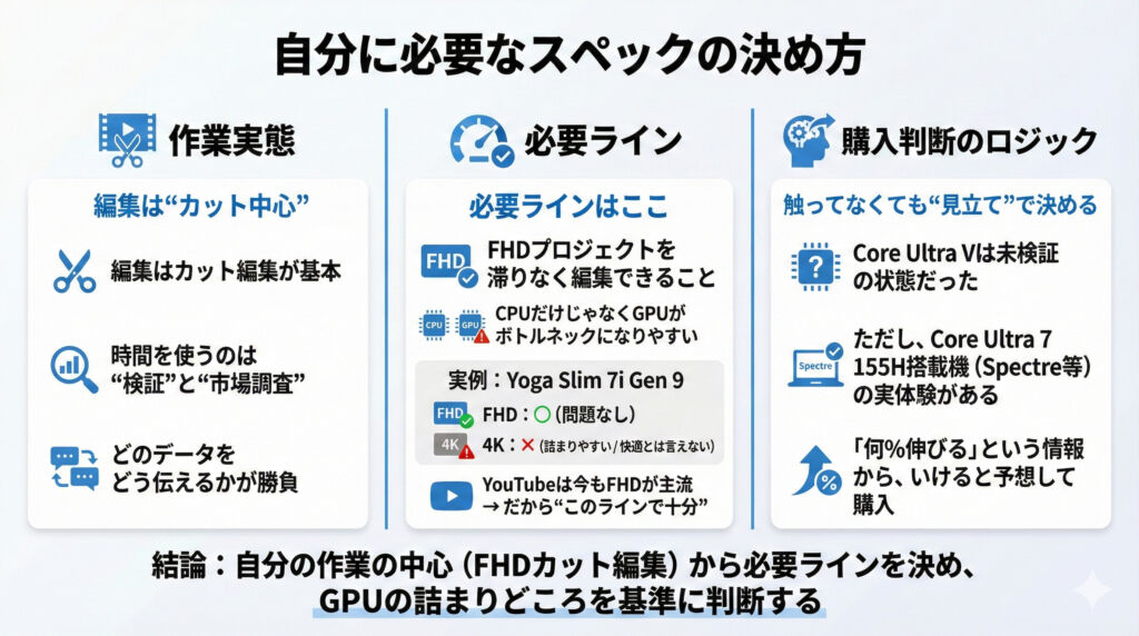 実際に自分が使いたい性能がどれくらいかというと、僕のYouTubeを見てもらえれば分かると思いますが、編集自体は大したことをやっていなくて、基本はカット編集のみです。どちらかといえば、検証パートや市場調査で「どのデータをどう伝えるか」を考えている時間のほうが圧倒的に長い。