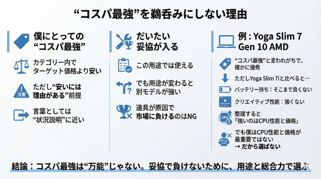 たとえば、コスパ最強と言われがちなYoga Slim 7 Gen 10 AMDは確かに優れています。でも、僕が今使っているYoga Slim 7iと比べたときにどうか。バッテリー持ちはそこまで良くない、クリエイティブ性能も強くない。結局「優れているのはCPU性能と価格」という整理になってきます。で、僕の場合はCPU性能と価格が最重要ファクターではない。だから、コスパ最強と呼ばれていても選ばない、という判断になります。