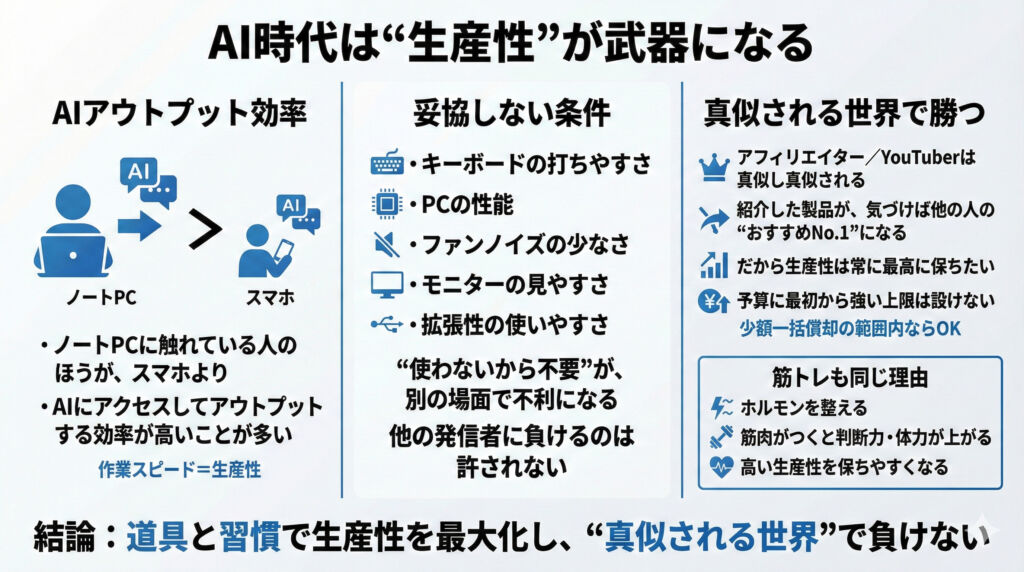 そうなったときに重要なのは、妥協した製品ではなく、キーボードの打ちやすさ、PCの性能、ファンノイズの少なさ、モニターの見やすさ、拡張性の使いやすさ――こういった部分がトップクラスに優れていることです。ここで「この機能は使わないから不要」と結論づけた結果、別の場面で不利になって、他の発信者に負けるのは許されません。