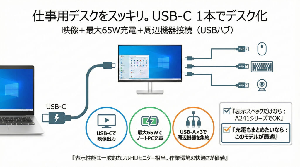 逆に、外部モニター導入の目的が「作業環境の改善」──特に ノートPCの充電も含めて配線を減らしたい のであれば、このモデルを選ぶ価値がはっきりあります。