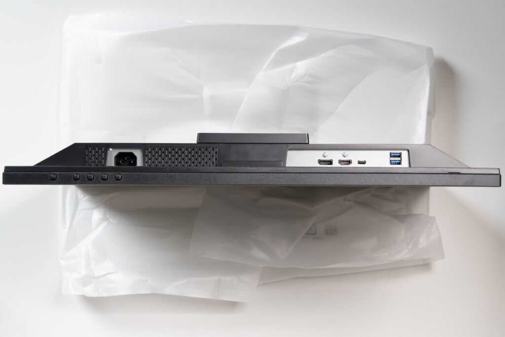 本機は、フレキシブルに動かせるスタンドに加えて、モニター背面にUSB-Cハブ機能を備えているのが大きな特徴です。