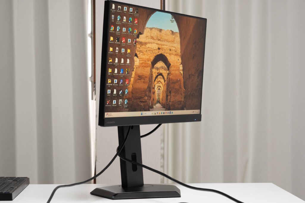 ノートPCと並べて使う場合、机の奥行きや座る位置によって“ちょっとだけ角度を変えたい”場面が多いですが、本機はこの微調整がしやすく、視線位置を合わせやすいのがメリットです。