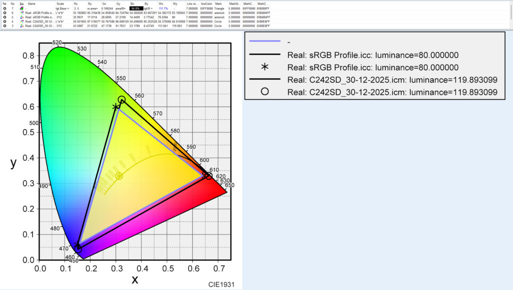 輝度は、公称値(メーカー公称:約250nit)に対して実測で約244nitでした。