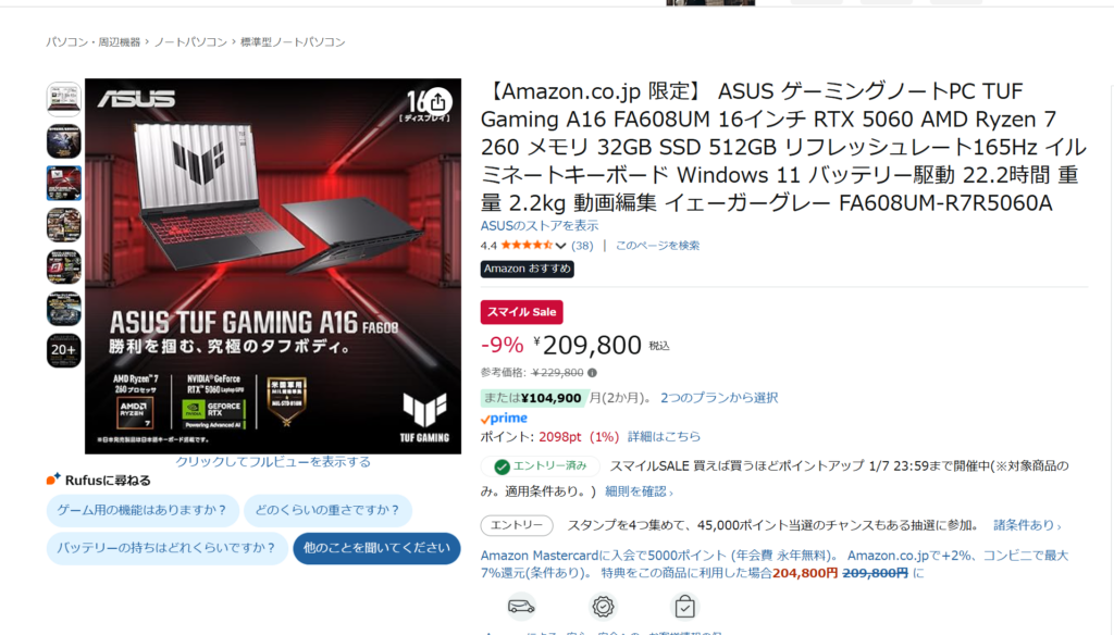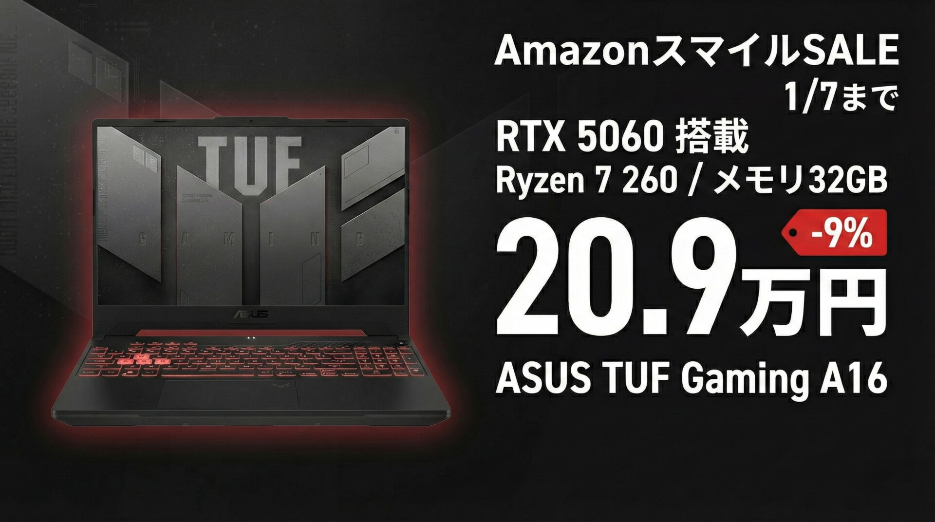 Amazonの「スマイルSALE初売り」(1月7日まで)で、RTX 5060 Laptop GPU搭載のゲーミングノート ASUS TUF Gaming A16(FA608UM)が、20万9,800円でセール中です。直近価格から約2万円安で、12月中旬のセール価格と同水準。値動きが荒い今の相場だと、この価格帯はかなり素直に“アリ”です。