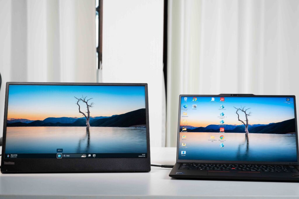 ThinkVision M15は15.6型のため、14型ノートPCと並べるとひと回り大きく見えます。ただ、極端にサイズ差があるわけではなく、実際にデュアルディスプレイで使っても違和感は出にくい印象です。