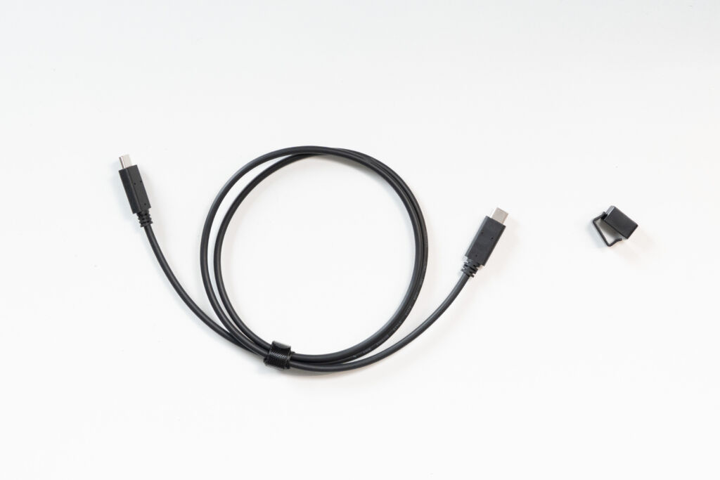 付属品はシンプルで、USB-Cケーブルと、スタンド部分を開閉した状態で固定するための**ロックパーツ(固定クリップ)**が同梱されています。