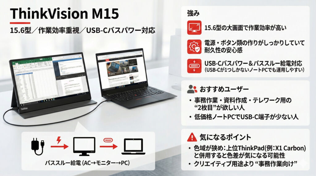 ThinkVision M15は15.6型と画面が大きく、ノートPCの“2枚目”として使うことで作業効率をしっかり上げられるモバイルモニターです。ボタンや電源まわりの作りも丁寧で、安価なモバイルモニターにありがちなチープさが少なく、耐久面でも安心感があります。