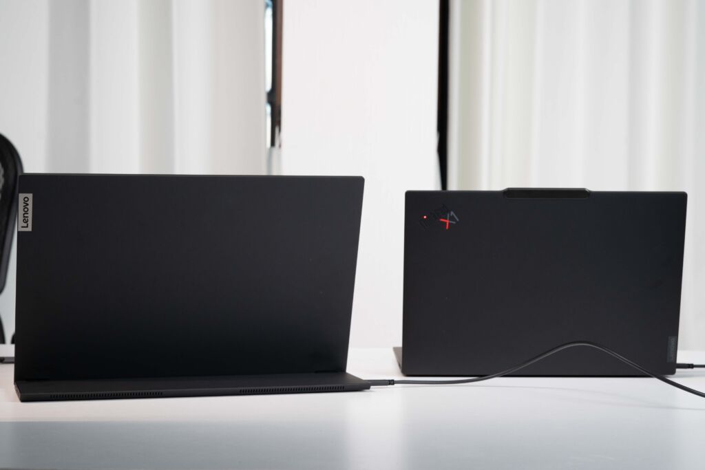 デザインは、ThinkPadシリーズと並べたときに違和感が出にくいのが大きな強みです。ブラック基調の落ち着いたトーンやロゴの主張の少なさ、表面の質感も含めて、いわゆる安価なモバイルモニターにありがちな“ガジェット感”が出ません。